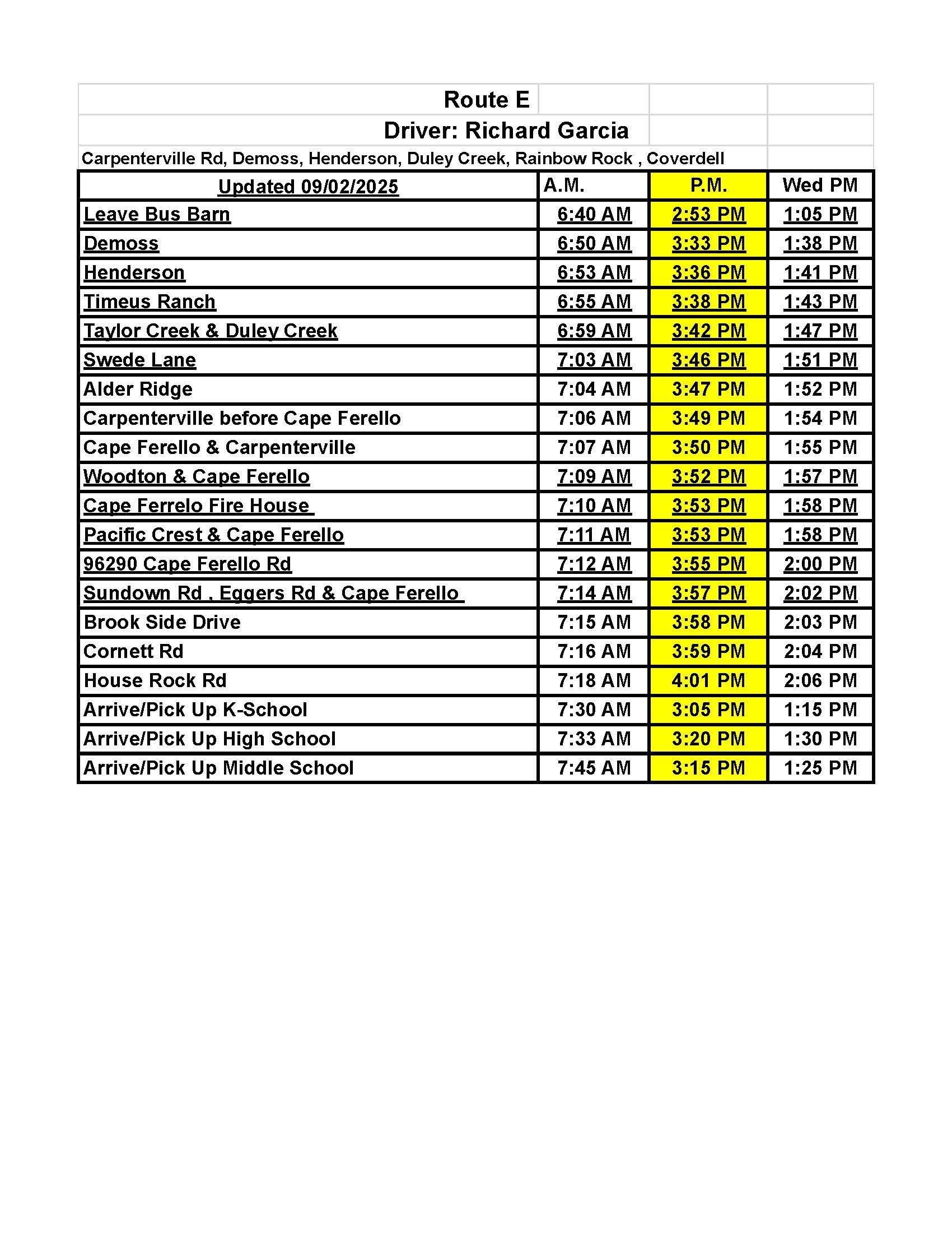 - Route E: Pick up for Cape Ferrelo area students will be at the base of Cape Ferrelo road, just before the intersection with Highway 101.